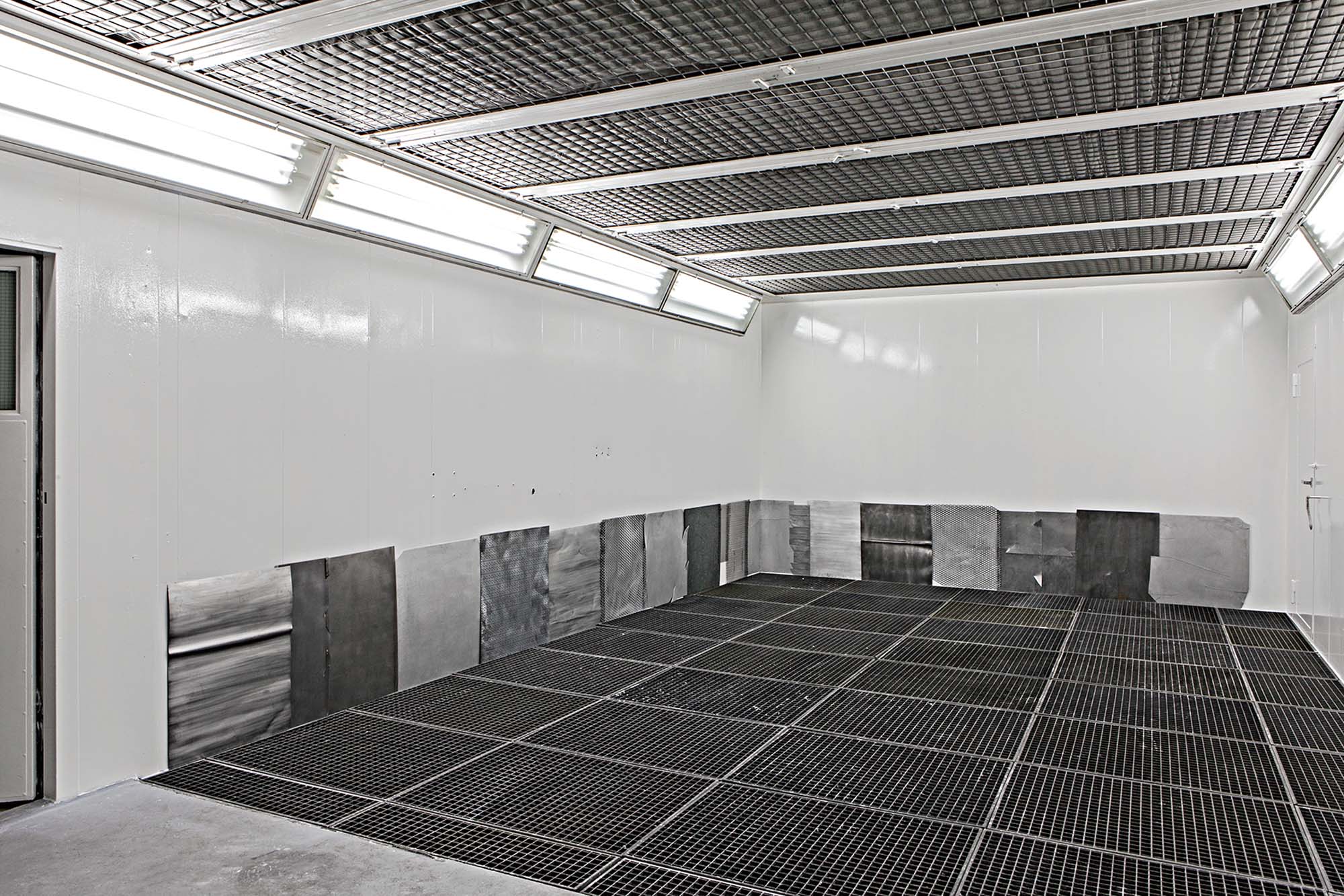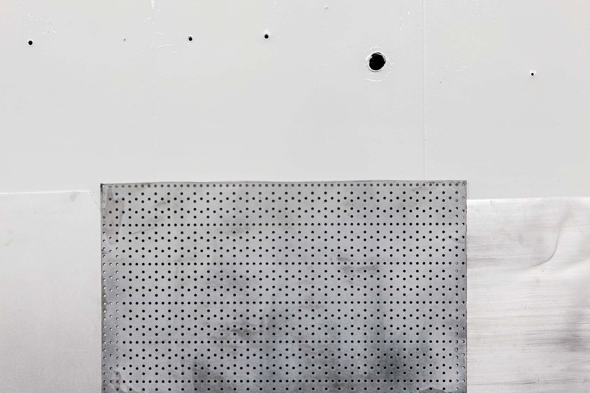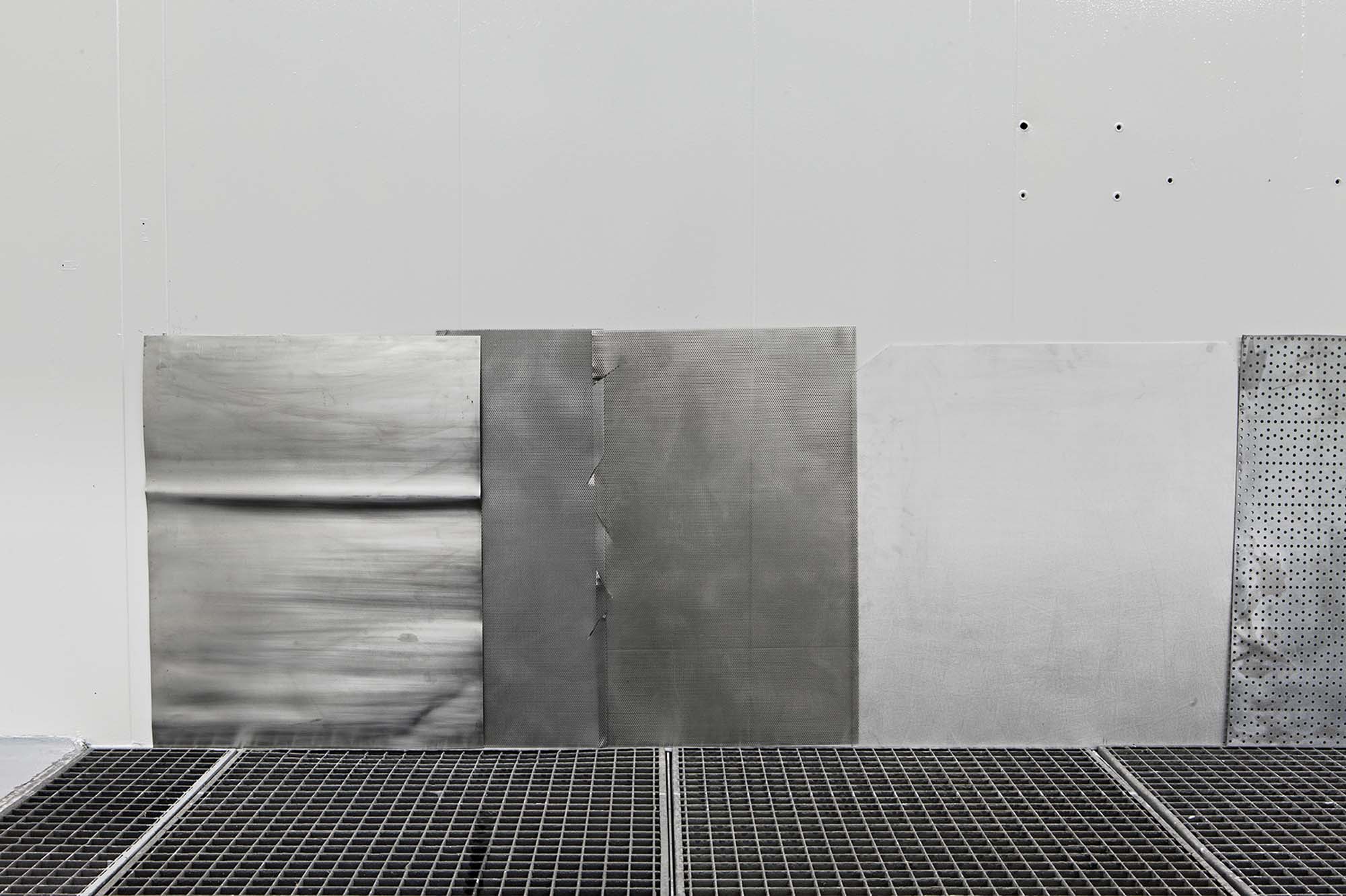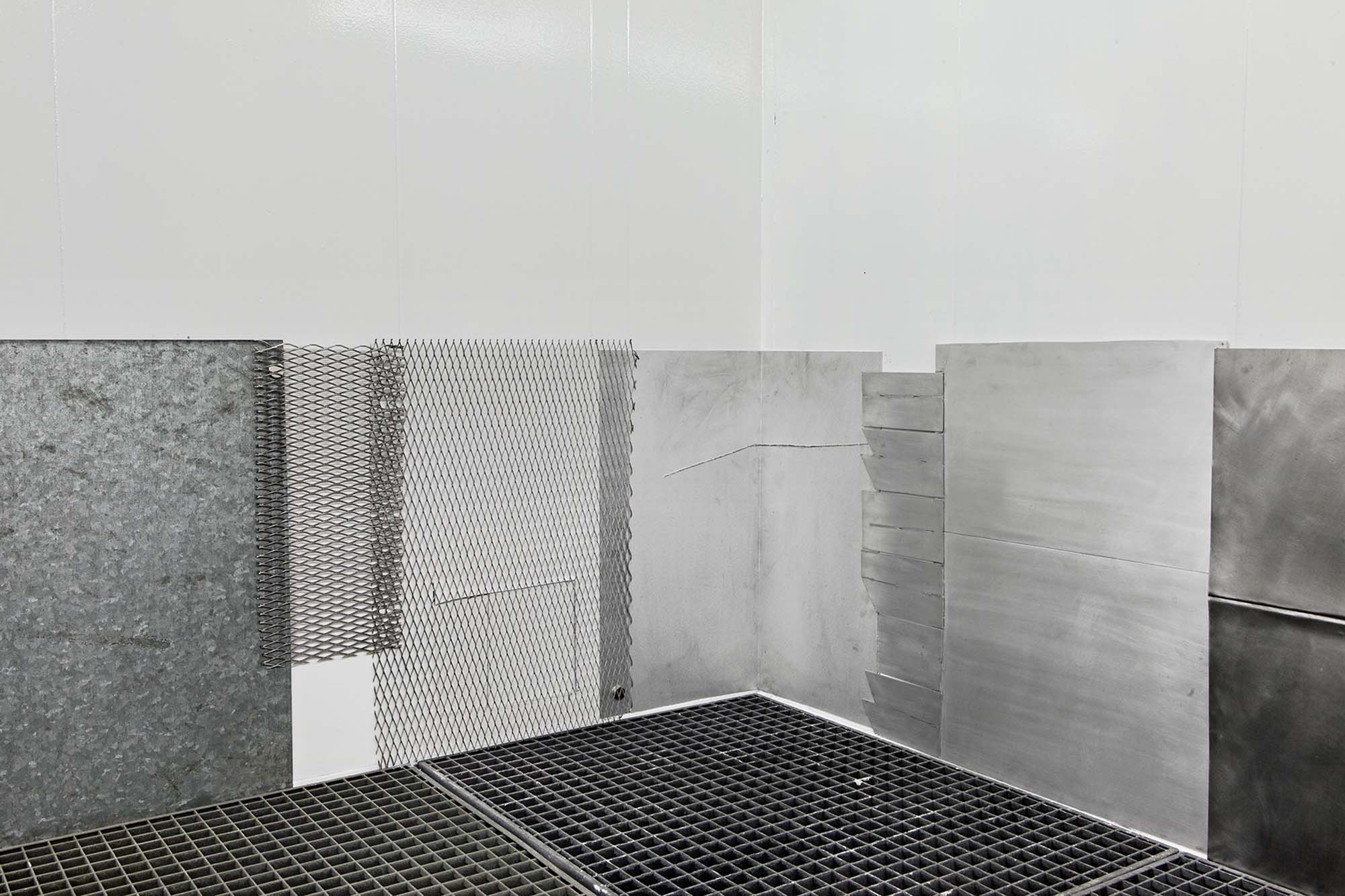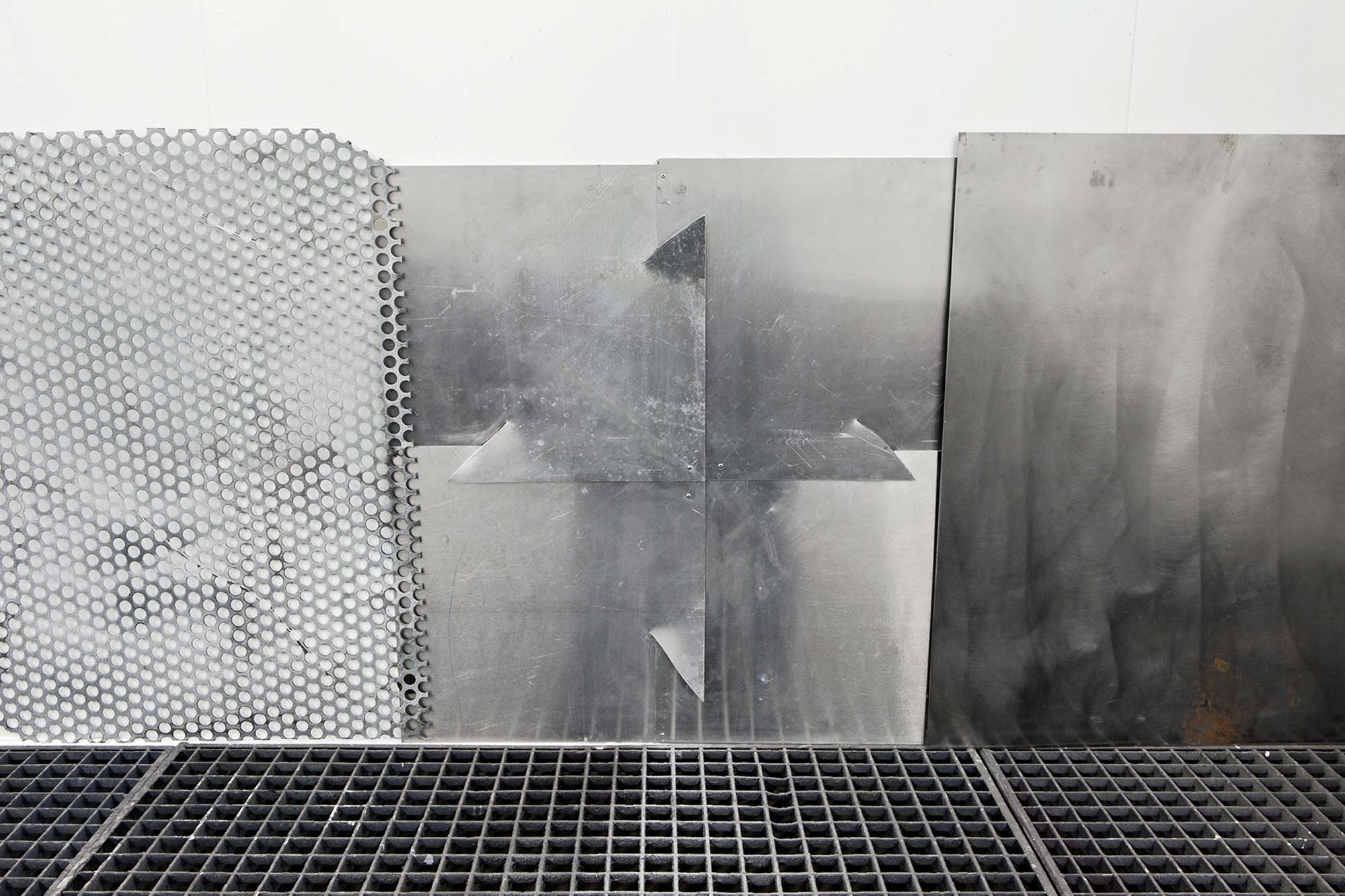 Hand Cut Metal Plates, 2016, collected and found metal plates, magnets, mesh, isomalt sugar, hooks, dimension variable, shown at Taylor Macklin, Zurich